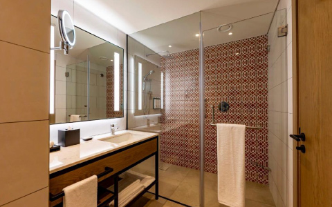 Each room is equipped with a flat-screen TV, air conditioning, a minibar, and a private bathroom with complimentary toiletries.